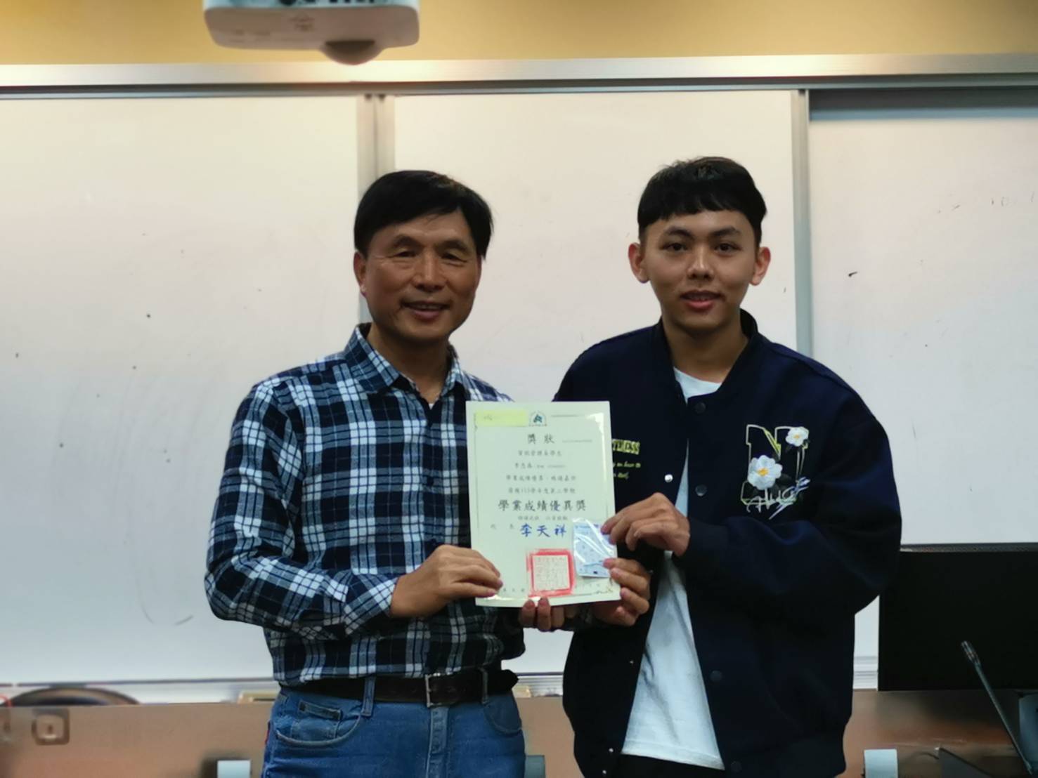 ▲林文暉老師(左)頒發學業成績優異獎予三年級李忠森。(圖/崑山科大提供)