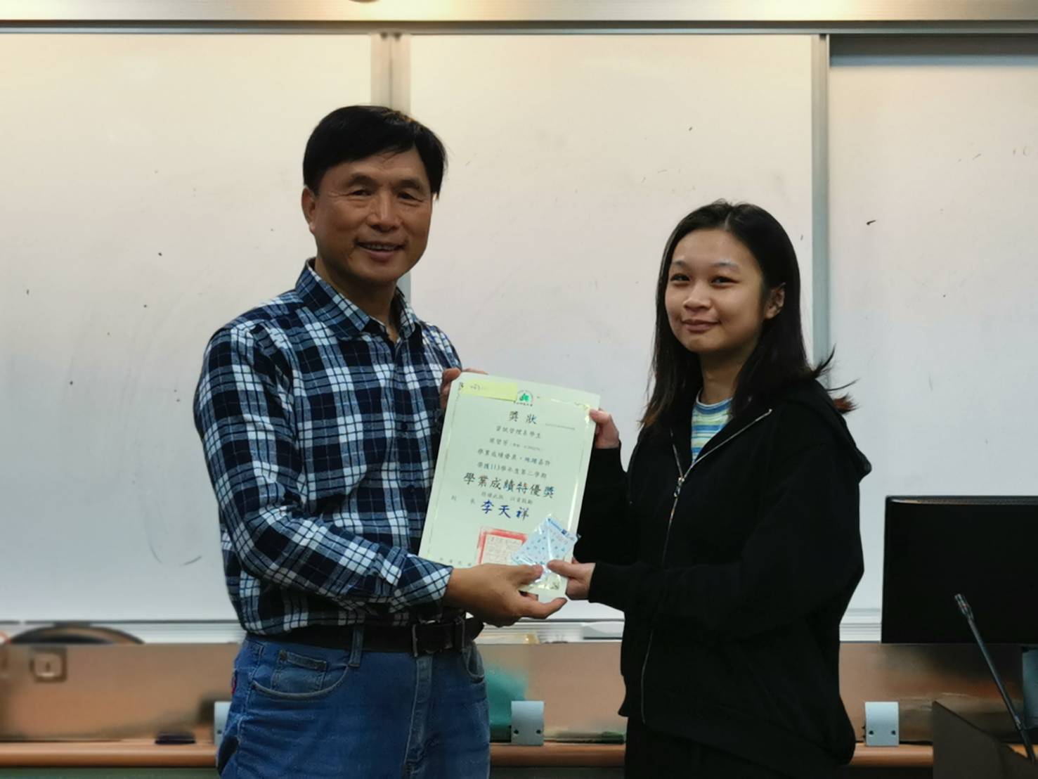 ▲導師陳哲斐(左)頒發學業成績優異獎予四年級趙子蕊。(圖/崑山科大提供)