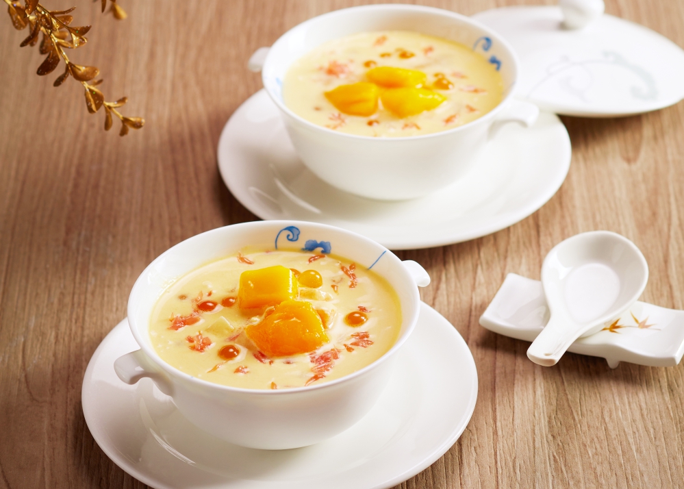 ▲以香氣濃郁的芒果搭配柚子與葡萄柚的楊枝甘露,加入西谷米與椰果增添口感,最後以牛奶融合果香,點綴百香果爆珠,為正宗港式甜品注入清新創意。(圖/圓山大飯店提供)