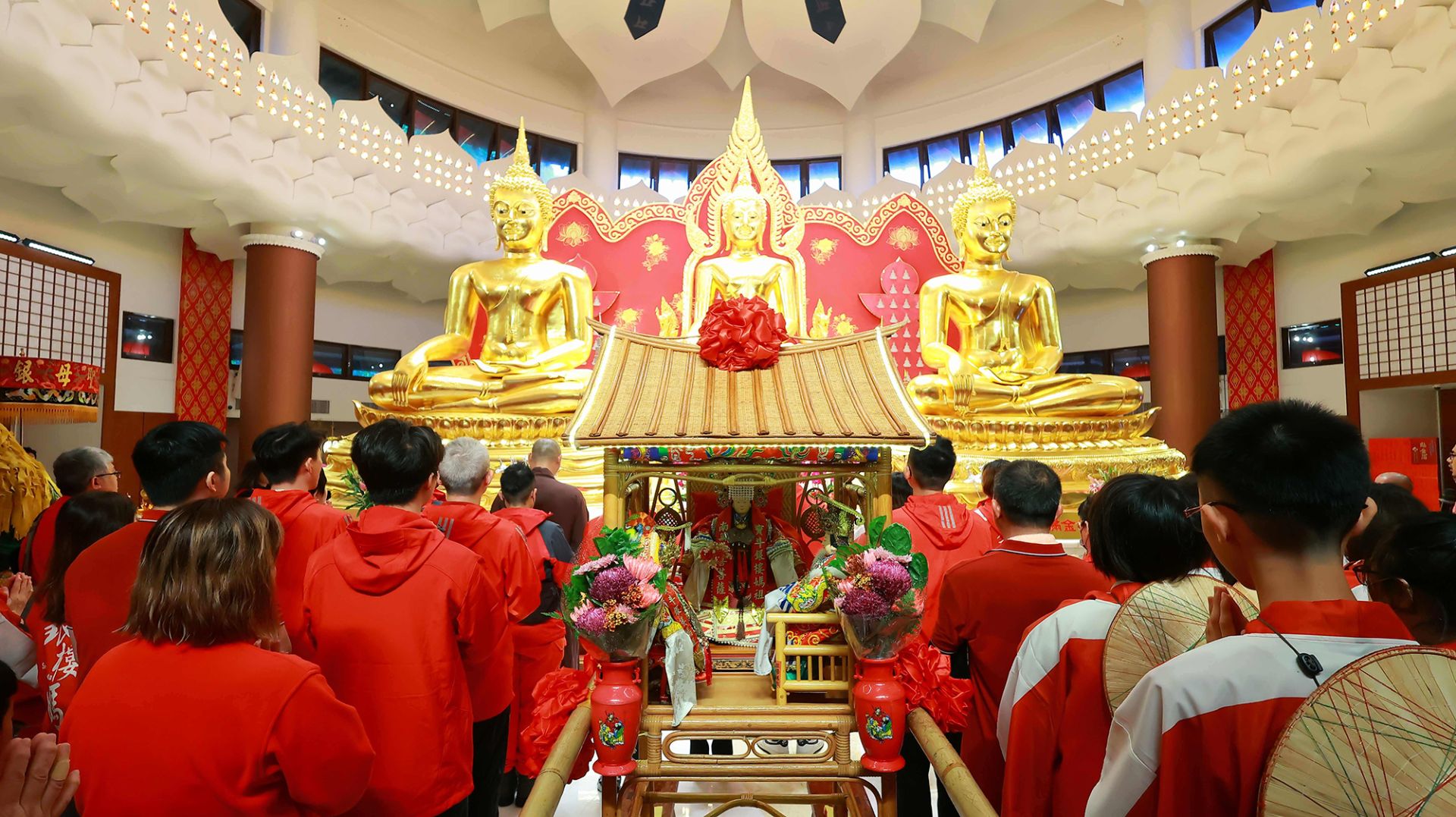 ▲媽祖鑾轎莊嚴進入金佛殿,眾人合十供燈,以六供養禮佛。(圖/靈鷲山佛教教團提供)
