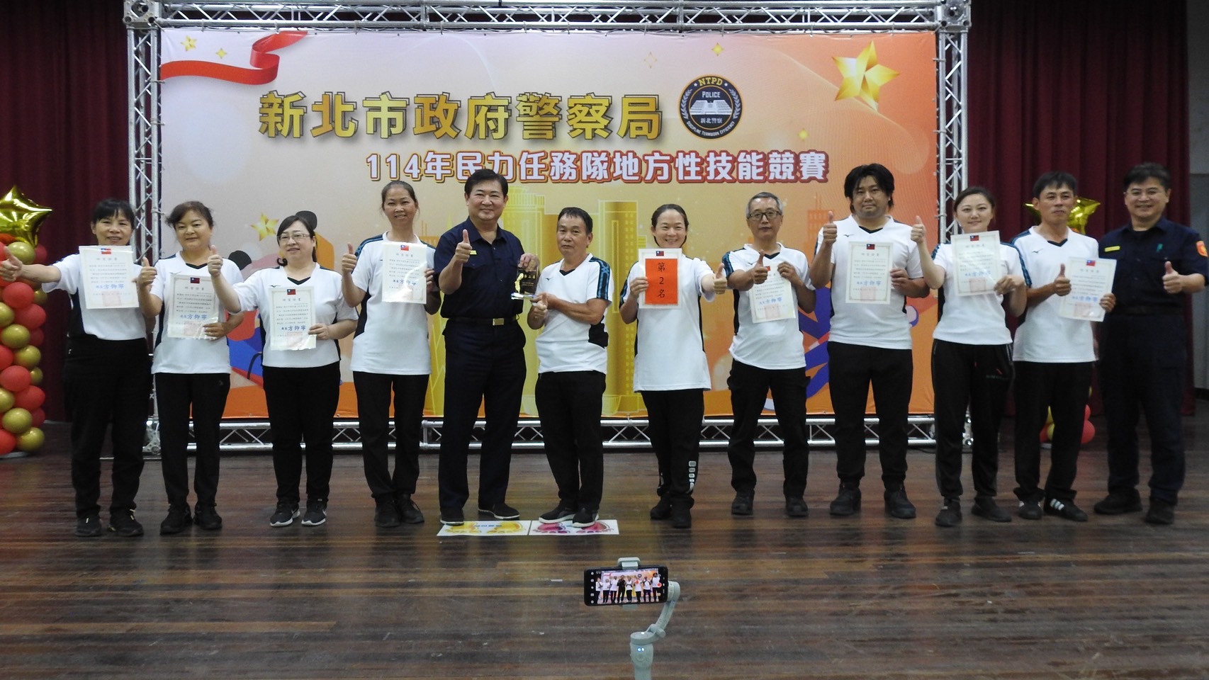本次新北市政府警察局所舉辦「114年民力任務隊地方性技能競賽」於10月16日8時30在中和區民安街172號中正堂隆重舉行,參與人員由警察局所屬的16個分局各遴選10名民力人員組隊所組成,而民力所屬大隊民防大隊長吳建亨、義勇警察大隊副總幹事李嘉源、交通義勇警察大隊中和中隊長張自強等貴賓亦到場參與並鼓勵參賽人員全力以赴爭取榮譽。