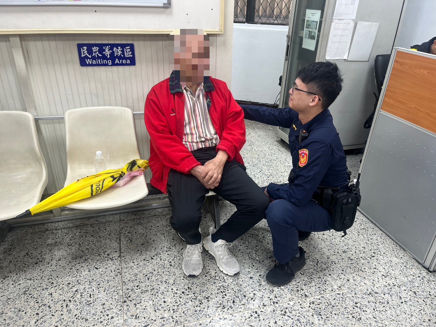 經警員黃士承、吳鎧聿查看該名老翁意識清楚,但無法自行起身,遂通知119救護人員到場檢視,確認其身體狀況暫無大礙;惟老翁疑似患有失智症狀,無法清楚表達身分,於是先行將其帶返回派出所。