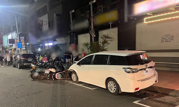 經調查,50歲的王男駕駛白色自小客車沿德賢路行駛,疑因精神不濟,先追撞在前方停等紅燈的黑色自小客車,再碰撞到停在路旁停車格內的12輛機車與2輛微型電動二輪車,所幸僅王男臉部輕微挫傷無大礙。警方對現場的2名駕駛實施酒測並無酒精反應,詳細肇事原因仍需調查後送往交通警察大隊分析研判。
